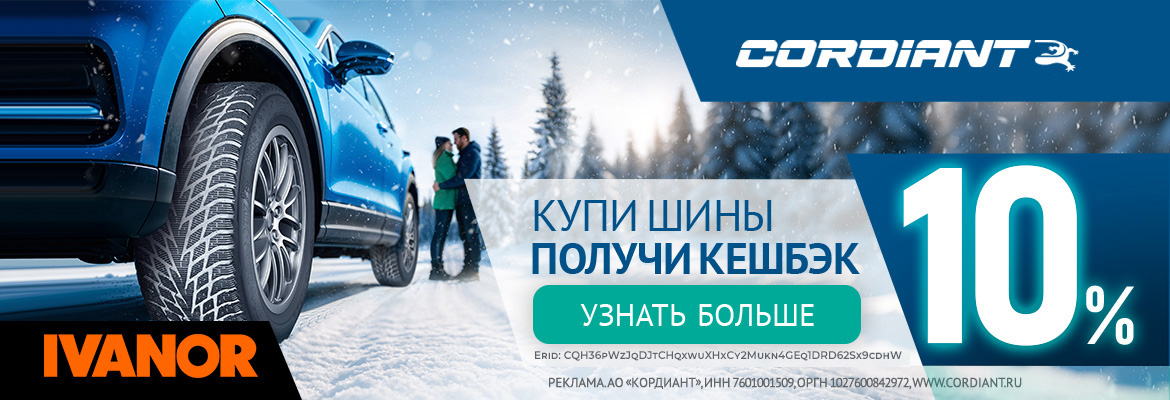 с 01 сентября 2025 года по 31 декабря 2025 года Cashback за покупку шин бренда Cordiant 10%!